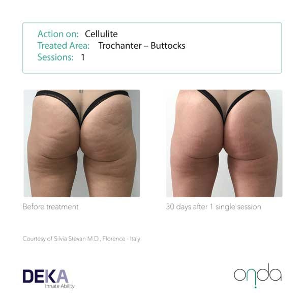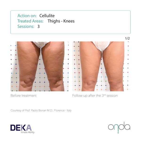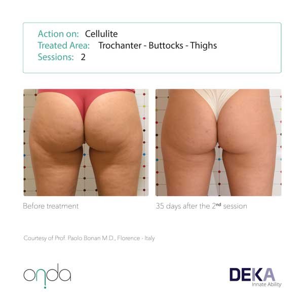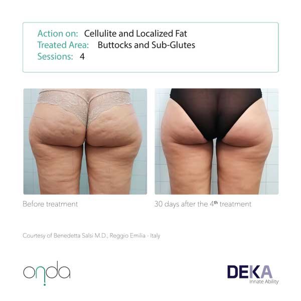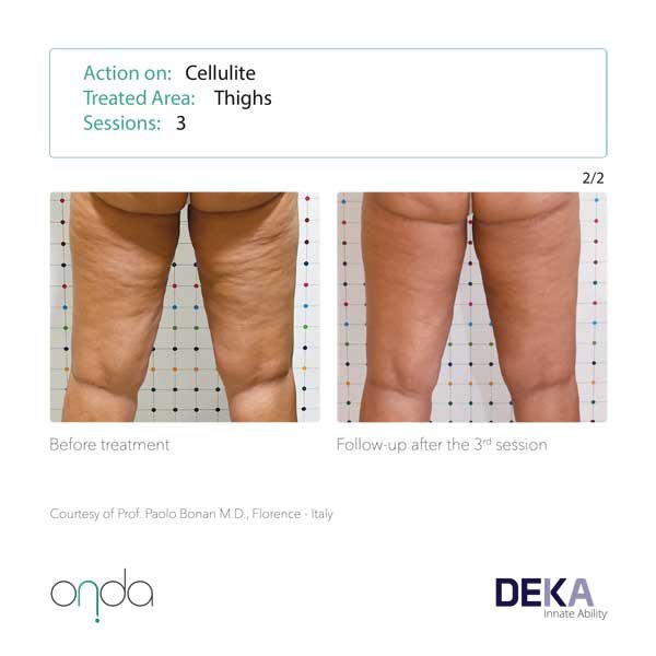 Cellulite: Coolwaves™ effectively targets the connective tissue (septa) between the adipose lobules in different stages of cellulite. The Septa through the thermal action are solubilised, which regenerate and stimulate new and more elastic collagen fibres. The results are almost immediate and as result ONDA is now considered the most effect device to fight cellulite.